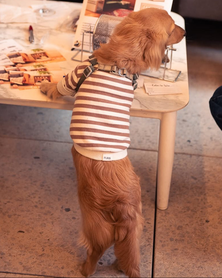 The Camden Brown Striped Dog Sweatshirt was designed for our favorite preppy pup. Studious and sartorial, this soft fleece crewneck is extra cozy for your furbaby's maximum comfort. Brown and ivory stripes cover the body from head to tail, accented with ivory cuffs, hem, and collar. Your pup is sure to ace the style test every time in this cute crewneck.