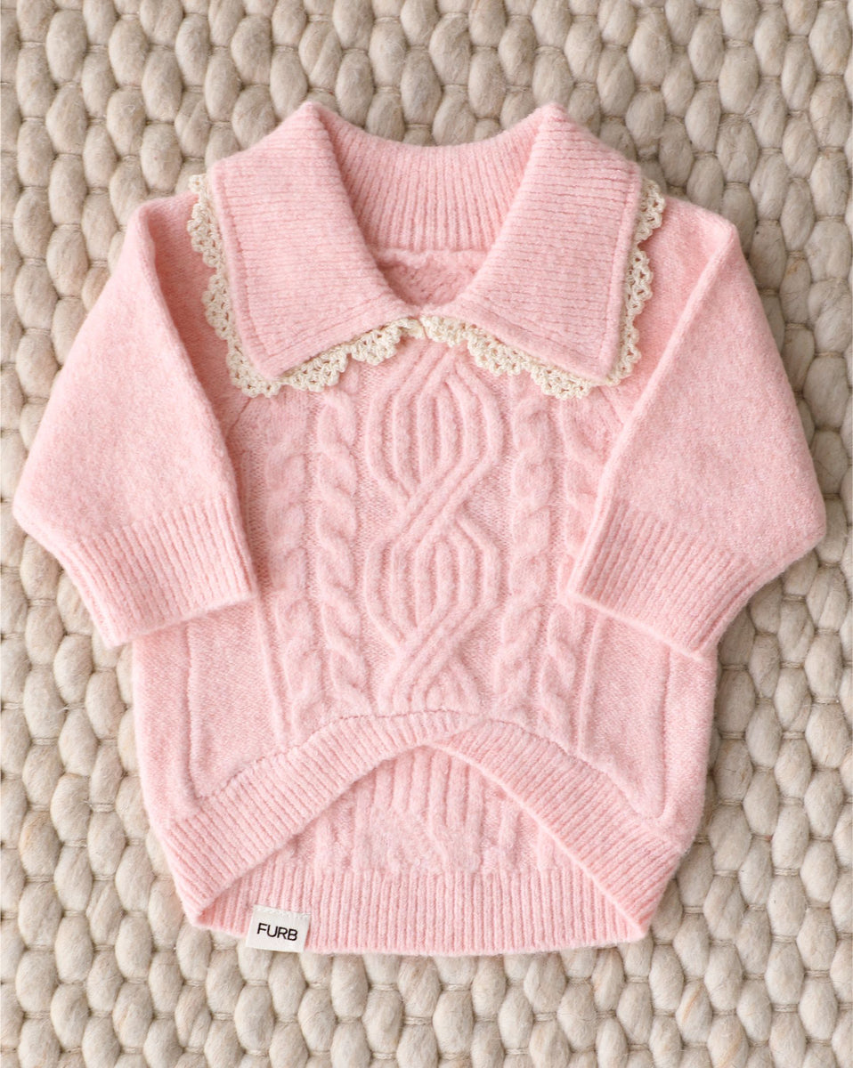 The Tea Time Pink Cable Knit Dog Sweater turns cozy into couture. Featuring a timeless cable knit texture and an adorable Peter Pan collar trimmed with lace, this piece is equal parts warmth and whimsy. Perfect for chilly strolls or cuddly afternoons, it’s made with soft, breathable knit that keeps your pup comfy and camera-ready.