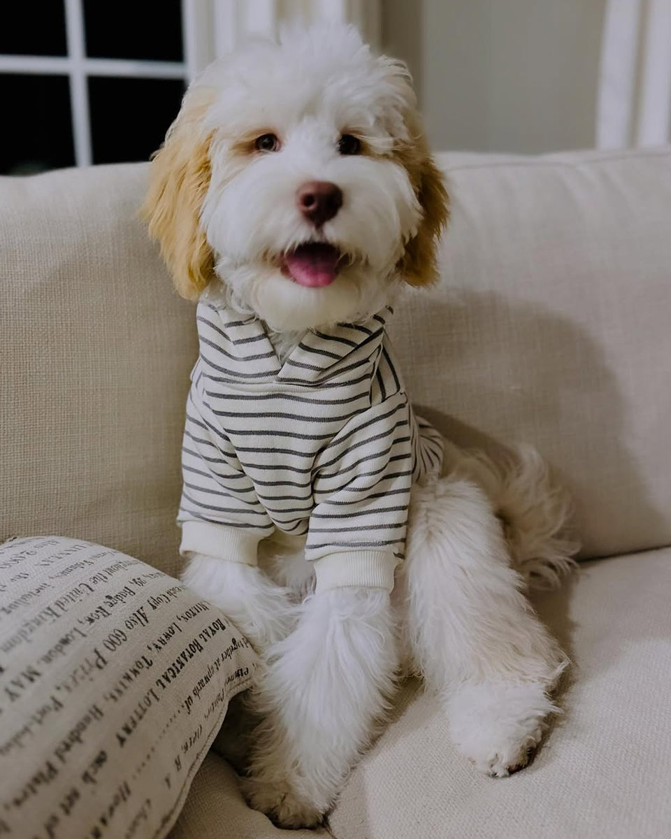 The Ziggy Grey Stripe Dog Hoodie will make your furbaby the talk of any town, from tip of the adorable hood to the soft ribbed hem. Soft fleece keeps your pet cozy, with ribbed cuff accents and perfectly spaced stripes. Put your pup in something that says, "I'll go anywhere with you."