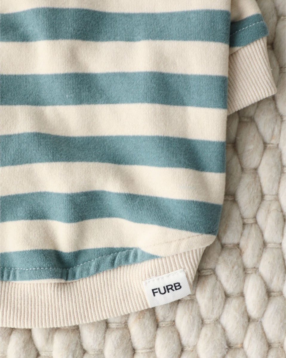 Meet the Remy Dusty Teal Stripe Dog Hoodie - an updated remix of a fan favorite. Crafted with cozy cotton fleece, this hoodie is the perfect athleisure piece. Ribbed accents and classic stripes give it that just-right balance of sporty and stylish, perfect for everyday adventures and weekend wandering alike. Put your pup in something that says, "I'll go anywhere with you."