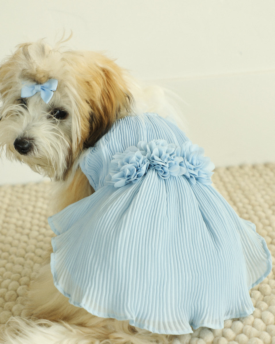 The Love Story Ice Blue Pleated Chiffon Dress is truly where fashion meets fur. Your big day wouldn't be complete without your fur babe, and this dress is sure to steal the show. Head to tail perfection, this dress is made of soft chiffon, with pleats that cascade perfectly from fluttering sleeves to a ruffled hem. The ice blue color is stunning, and three fabric flowers add a chic accent that will have everyone saying "aww". It's time for your flower girl to strut her stuff on this special occasion!