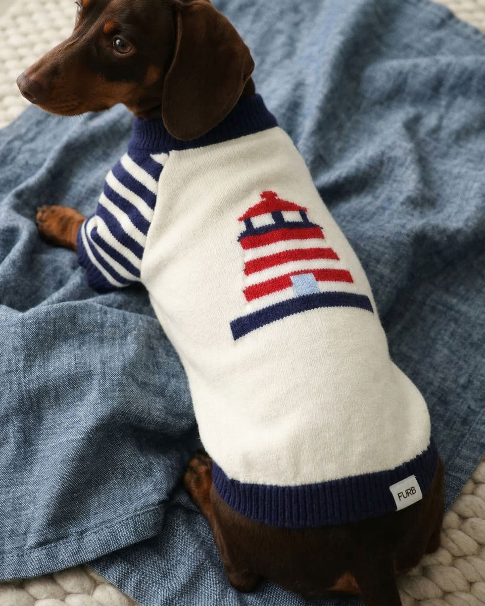 The Shore Thing Lighthouse Sweater pairs timeless nautical charm with cozy, all-day comfort. Navy and white striped sleeves pair with an ivory knit body, finished with a classic lighthouse front and center for that unmistakable coastal Americana feel. Polished yet playful, this knit keeps your furry first mate comfy, cute, and ready for every harbor stroll (aka every neighborhood walk).