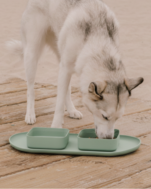Make a stylish statement for you and your pup with the Hip To Be Square Dog Bowl + Mat Set in Green.