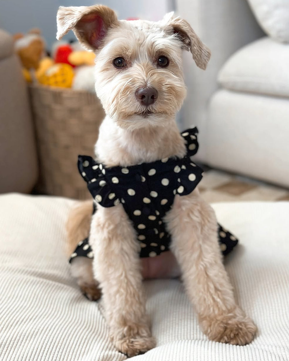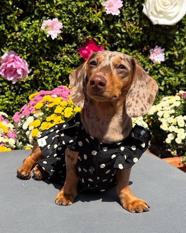 The Gigi Black + Ivory Polka Dot Dress is truly where fashion meets fur. This stunning little dress is head to tail perfection, with soft satin and frilly accents for your little starlet. Fabric-covered buttons + ruffles on the sleeves and bottom hem add just the right amount of flair. Time for your little fashionista to strut her stuff!
