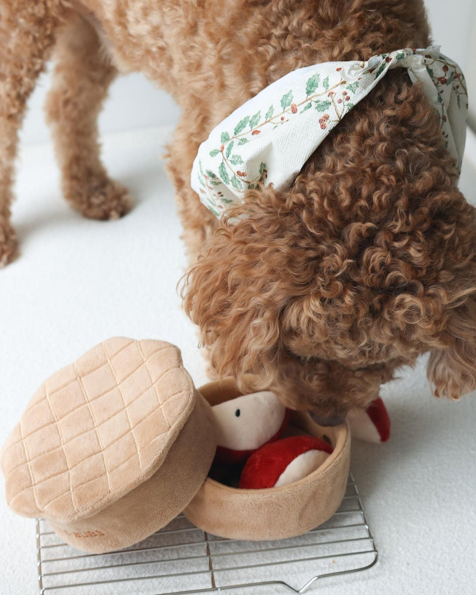 Treat your pup to a slice of enrichment play with the Sweet As Pie Snuffle Dog Toy. Designed with a liftable pie “lid” and removable apple slices, this bakery-inspired snuffle toy lets your dog sniff, search, and snack their way through every delicious detail. Scatter treats inside the pie case and close the lid for an extra challenge, or tuck rewards into two of the apple slices for bonus nosework fun. Lined with crinkle paper, packed with squeakers and reinforced with durable nylon, this cozy classic serves up stimulation with every play session.