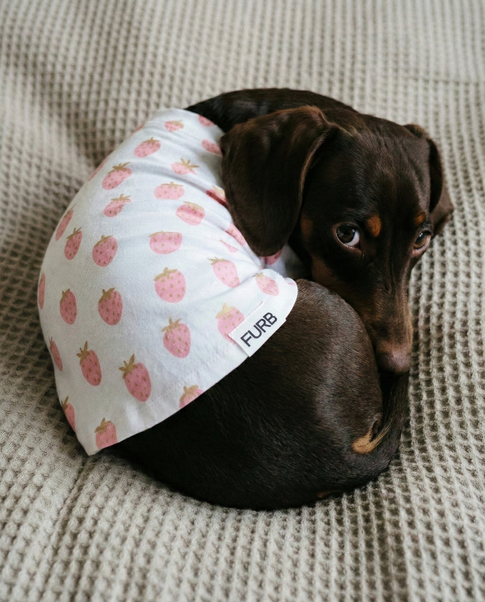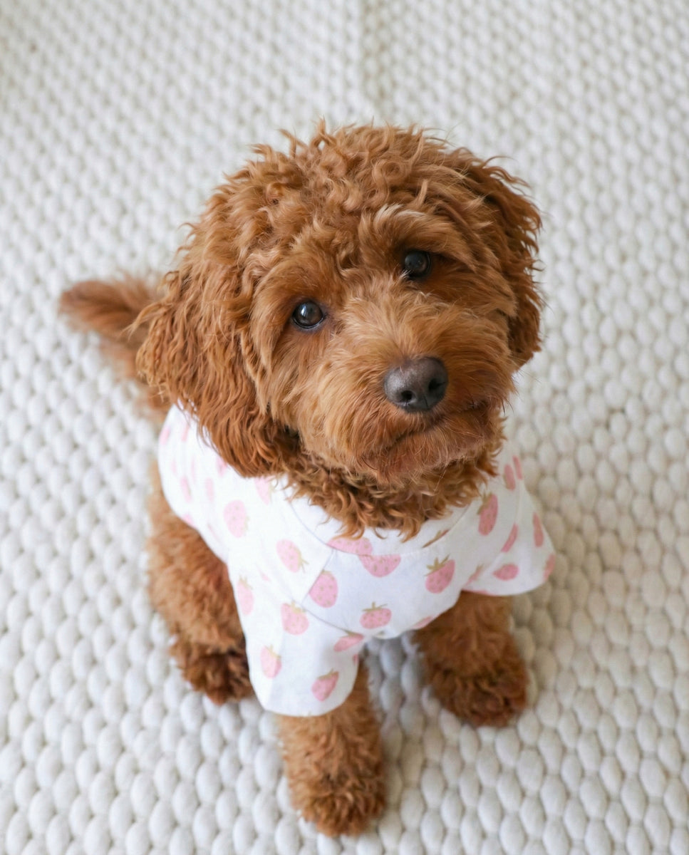 The Stay Sweet Strawberry Print Dog T-Shirt is handprinted on high-quality, breathable cotton, expertly cut for a perfect fit. Adorable strawberries pop against a chic neutral background. This stylish, ready-to-wear accessory is perfect for the season and available for dogs of all sizes.