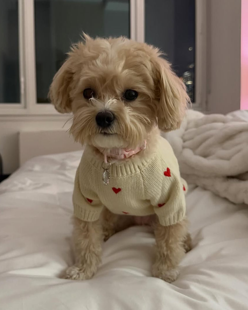 The Fur-ever Yours Heart Dog Sweater is made for dogs who wear their hearts on their sleeve (literally). Crafted from a super-soft ivory knit and finished with delicate red hearts. Perfect for snuggly days or stylish strolls, this sweater is a true love letter to your pup’s heartwarming style.