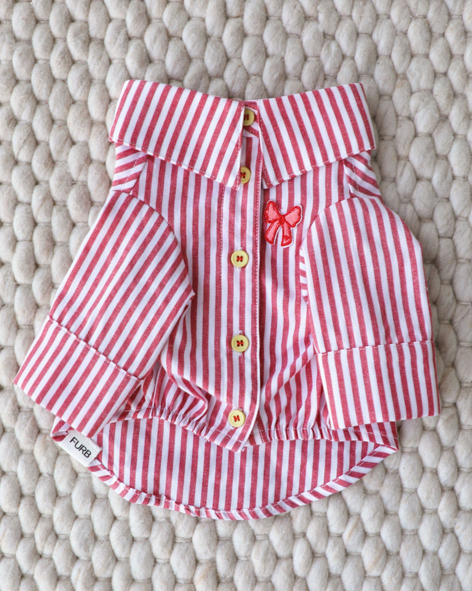 The Nantucket Red + White Striped Button-up dog shirt meets style with substance, for a pup with purpose. Allover red stripes and functional buttons make us want to pack our bags and head somewhere charming. A pink bow patch is paired with contrasting yellow buttons for an extra pop of color, telling the world (or at least the entire dog park), "I mean business, but I'm also adorable."