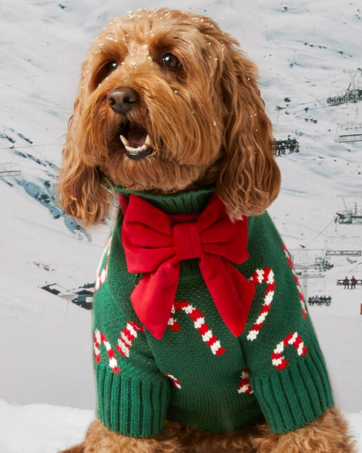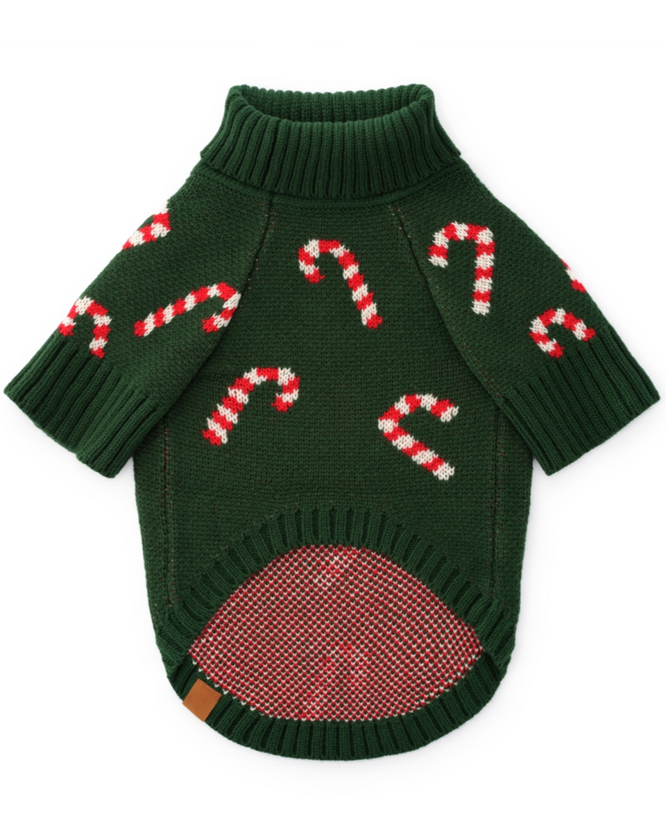 The Candy Cutie Green Knit Dog Sweater is a sweater as merry as your pooch. This pullover turtleneck sweater features soft, machine-washable acrylic knit that stretches to fit a variety of shapes, from barrel-chested pups to petite pooches. A convenient leash/harness hole makes walks easy, and the neck and sleeves can be rolled for a customized fit. Whether dashing through the rain and snow or napping under the tree, this sweater keeps your pet warm and comfy.