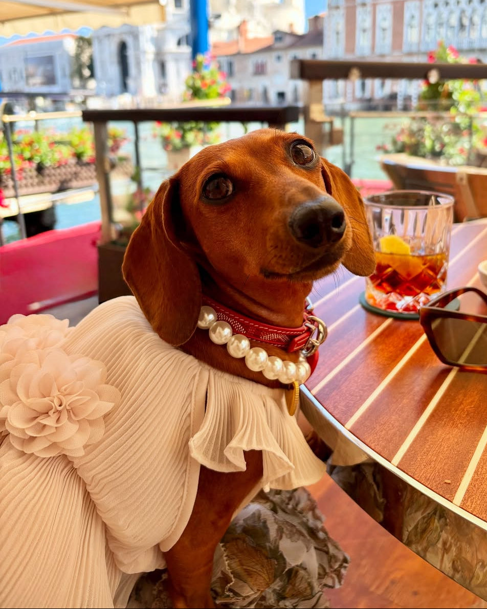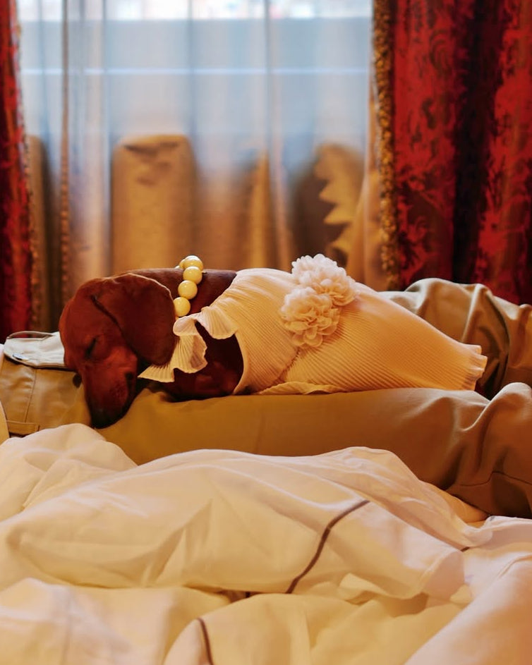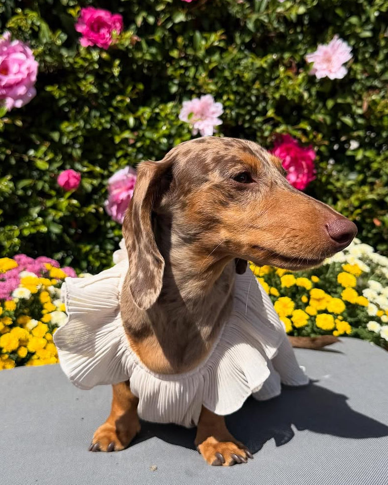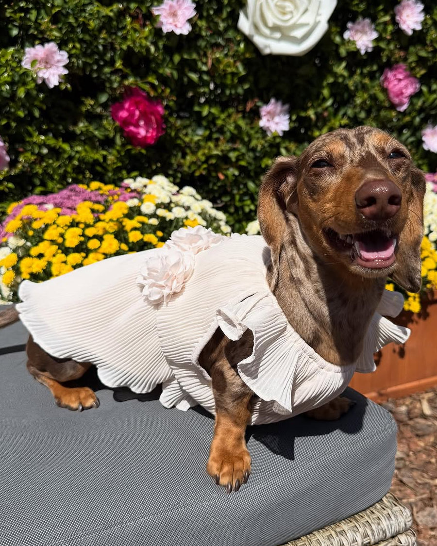 The Love Story Petal Pink Pleated Chiffon Dress is truly where fashion meets fur. Your big day wouldn't be complete without your fur babe, and this dress is sure to steal the show. Head to tail perfection, this dress is made of soft chiffon, with pleats that cascade perfectly from fluttering sleeves to a ruffled hem. The petal pink color is stunning, and three fabric flowers add a chic accent that will have everyone saying "aww". It's time for your flower girl to strut her stuff on this special occasion!