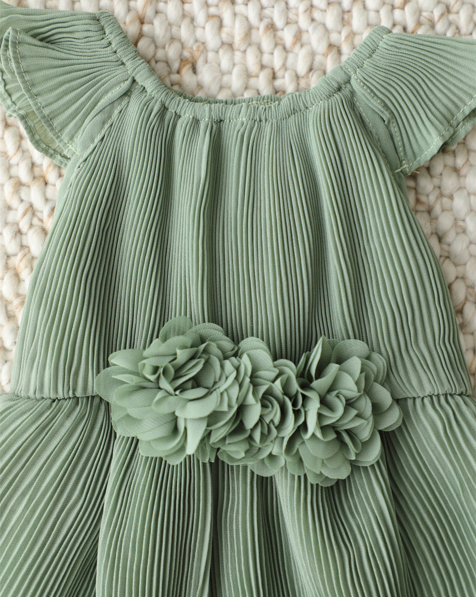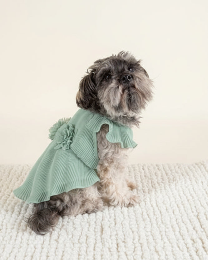 The Love Story Sage Green Pleated Chiffon Dress is truly where fashion meets fur. Your big day wouldn't be complete without your fur babe, and this dress is sure to steal the show. Head to tail perfection, this dress is made of soft chiffon, with pleats that cascade perfectly from fluttering sleeves to a ruffled hem. The sage green color is stunning, and three fabric flowers add a chic accent that will have everyone saying "aww". It's time for your flower girl to strut her stuff on this special occasion!