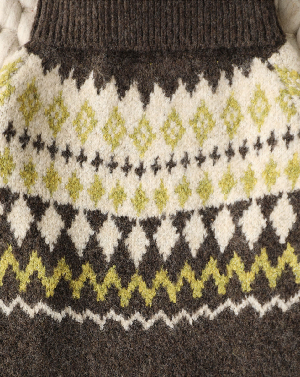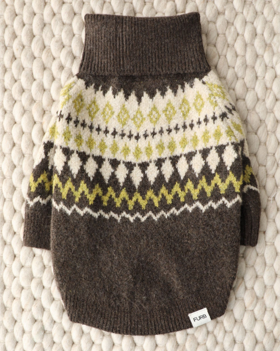 The Toasty Tails Fair Isle Dog Sweater brings a timeless winter knit to your pup’s wardrobe. Featuring a classic Fair Isle pattern in chocolate brown, creamy white and chartreuse, this cozy layer blends tradition with modern style. A ribbed turtleneck, cuffs, and hem add extra warmth. A fold-over neck and cuffable sleeves make it as functional as it is fashionable. Perfect for chilly walks and cozy nights in.